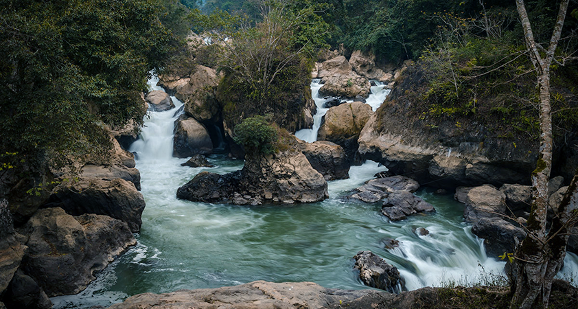 Nang River, after going through Lung Nham mountain to create Puong Cave, continues to travel to Hua Tang Village, where it meet thousands of stone blocks in different sizes and shapes, then creates Dau Dang Waterfall.