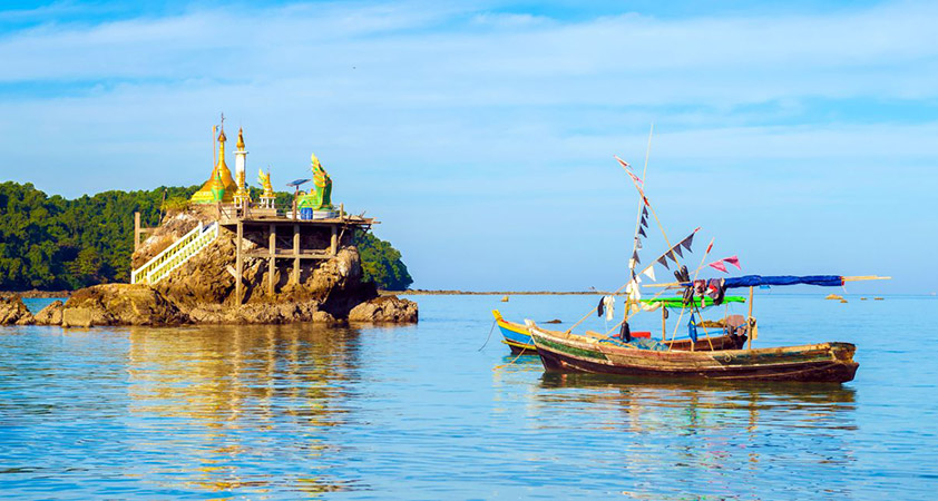 One of South East Asia’s largely undiscovered beach resorts, Ngapali is an idyllic, charming place near the town of Thandwe in Rakhine state, Western Burma. Located on the Bay of Bengal is a several kilometers long sandy beach lined with palm trees and the small boats of local fishermen. Possibly the best beach in Burma, Ngapali is a great place to enjoy swimming in the warm and clear waters or sunbathing while watching local fishermen bring their catch to shore. Tourists relax on beach chairs, shade is provided by reed parasols and palm trees. Burmese ladies walking the beach offer a variety of local fruits.