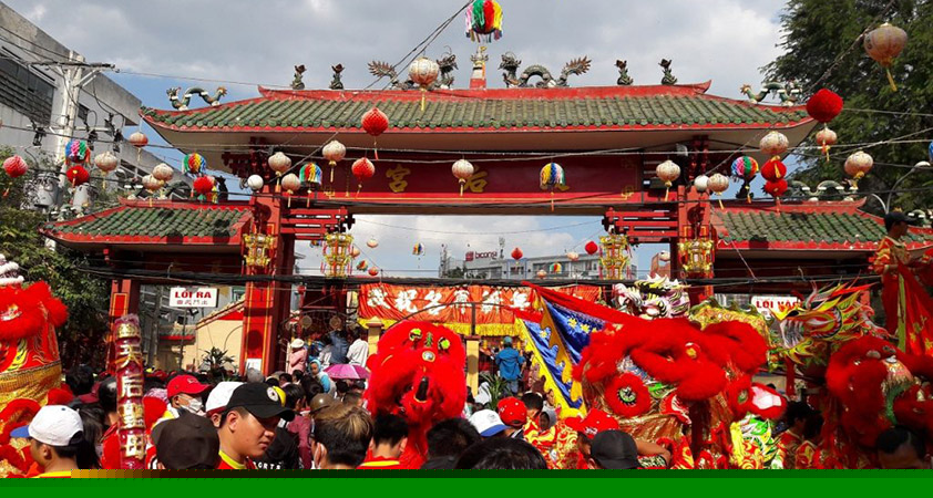 The temple is located right on busy Nguyen Trai Street. It can be accessed by entering through an iron gate and crossing a small courtyard. The roof is decorated with small delicately fashioned porcelain figurines expressing themes from Chinese religion and legends. Lanterns and wooden models of Chinese theaters hang over the entrance.