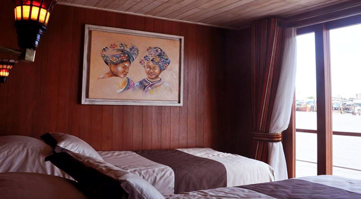 L’Amant Cruise combines traditional boat-building with modern comfort and can accommodate up to 24 passengers in its 12 cabins to cruise the Mekong in luxury. Measuring 39 m long by 7 m wide, L'Amant cruiser was built in a colonial style. The vessel offers a large restaurant, a bar and a sundeck where passengers will be captivated by the serenity and the beauty of nature throughout the journey on - Cai Be - Chau Doc - Phnom Penh