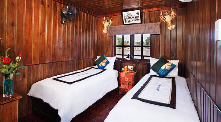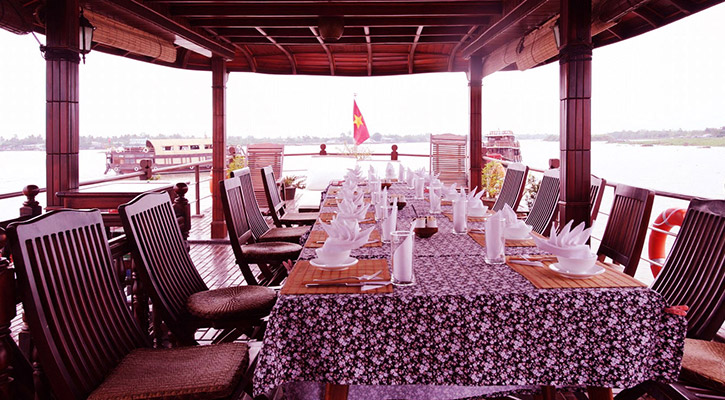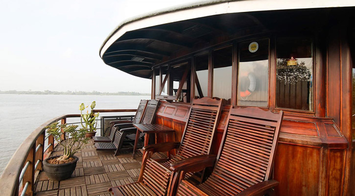 Le Cochichine is designed in the style of traditional rice barges. The boat consists of 3 boats of 6, 10, 14 cabins it will bring you an exciting discovery of the Mekong Delta. Cochinchine has an elegant and artist beauty. The cruise is in shape of shiny wood, make perfectly suitability with surrounding landscapes.