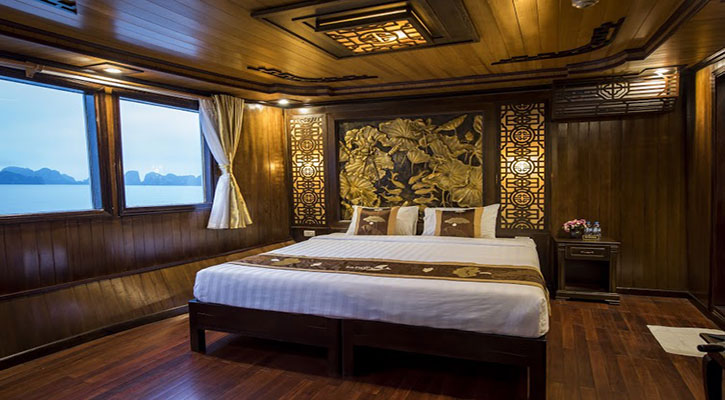 Halong Renea Junk has 11 luxury cabins to ensure intimate privacy and comfort for all guests. It will help you have a fantastic Halong tour on luxury and elegant Halong Renea Junk. The warm hospitality with superior service bring the best memories about Halong Discovery cruising blue water of Halong Bay. Locating in Halong Bay, Halong Renea Junk offers a splendid, sweeping view from its rooftop swimming pool and panoramic fitness centre.